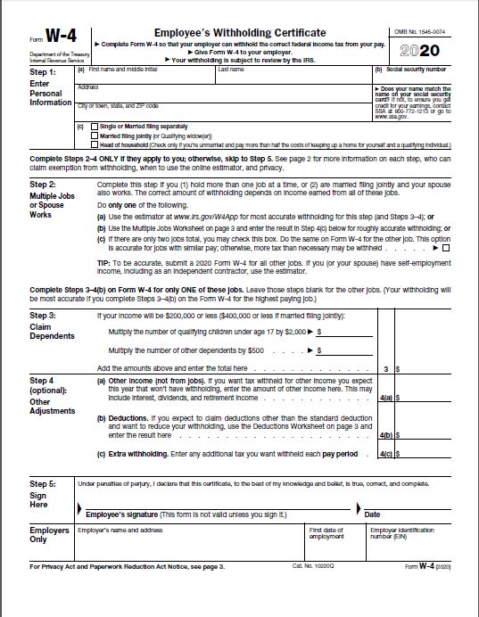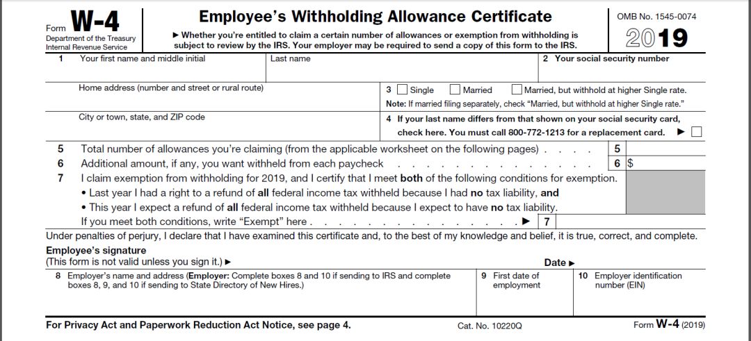 从2020年开始,W-4表的名称变更为“Employee's Withholding Certificate”。TCJA税改法案取消了按照人数计算的个人豁免额,所以W-4表中不再需要大量的行列来计算代扣代缴免除额(withholding allowances)。