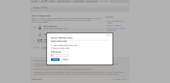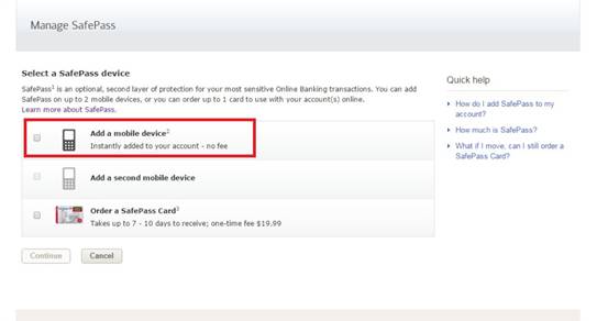 1.登陆账户后,将鼠标移到右上角的“Profile & Settings”,弹出菜单后请选择右下角的“Add Safepass”(因为笔者的银行账户已经开通了Safepass,所以显示的是“Manage Safepass”);2.弹出页面后,点击红色按钮“Add Safepass”;3.在弹出的页面里选择第一项“Add a mobile device” ;4.输入要绑定的电话号码,该号码之后会用来接收6位的安全码。输入完毕后点蓝色的“Continue”;6.开通功能时,银行会要求输入银行卡的信息以验证;7. 验证成功后,选择“Send Safepass Code”,将手机收到的六位安全码填入框中后选择篮框中的“place order”。“Safepass”就开通完成了。