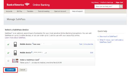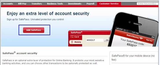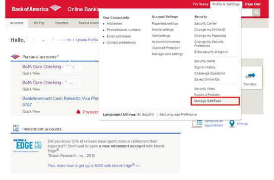 在Bank of America开户,所需要提供的文件比较简单,包括护照、在中国开的银行卡或信用卡(上面有申请人姓名的Visa或者Master Card)或者美国如COSTCO、BJs这样有名字和照片的会员卡。另外需要提供一个在美国的地址,用于接收银行卡和银行文件。在开户时,银行的工作人员还可能会问到开户者在中国是从事什么工作的。被问到的话不必太过于紧张。银行问这个问题主要是出于中美联合反腐考虑。所以银行对政府工作人员或在政府任职者的开户要求会更加地小心谨慎。正常工作或者经商的人,也就是简单询问一下, 一般不会要求提供证明文件。因为很多中国投资人不会常年在美国, 所以账户能够大额网银转账是很重要的。 开户完成后,推荐大家开通一下Bank of America的Safepass功能。Safepass相当于国内银行的验证码接收器,可增加对外转账时的限额。开通之后在处理大额的转账时,不需要再去银行柜台,在任何地方网上即可完成。使用这个功能需要绑定一个能接收短消息的美国的手机号码,用户在网银上操作转账时,银行会给绑定的手机发一个安全码,在网银上输入安全码即可完成转账。下面我给大家简单介绍一下怎么开通Safepass: